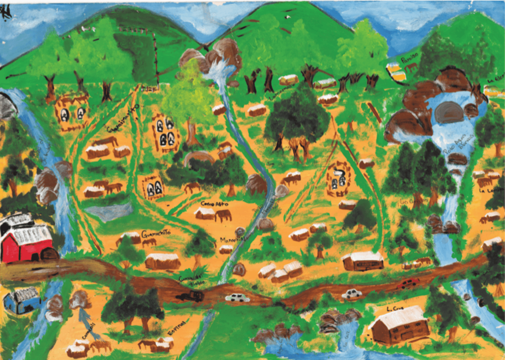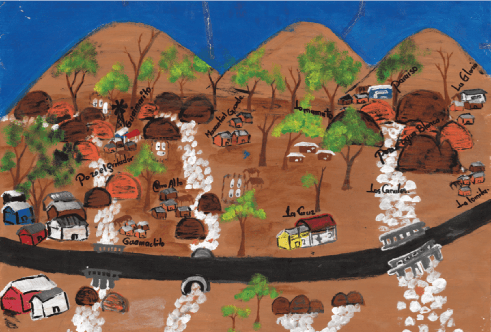 These paintings, produced by Alexander Curvelo from the Wayuu Ipuana clan, show the Lomamato resguardo (reserve) before and after the arrival of the Cerrejón mine. Of the many changes to the resguardo depicted, perhaps the most notable are the loss of water sources and vegetation. The paintings feature in a publication produced by the Colombian NGO Cinep/ PPP titled Agua y mujer. Historias, cuentos y más sobre nosotras, la Pülooi y Kasolü en el Resguardo Wayuu Lomamato (Women and water. Histories, stories and more about us, the Pülooi y Kasolü in the Wayuu reserve Lomamato).