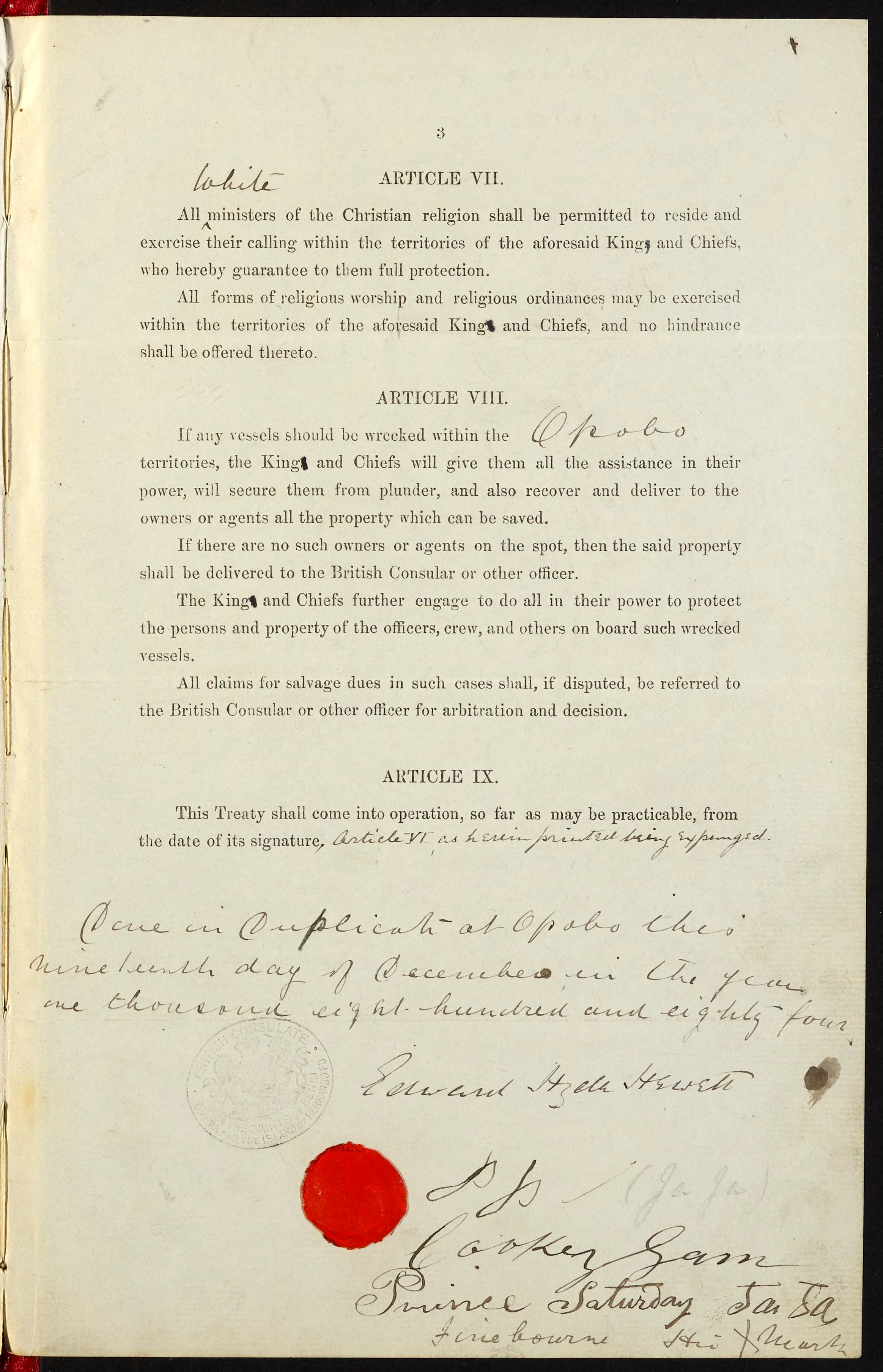 Whilst in Article VII a racial distinction is inserted to specify that rights granted to Christian ministers are only applicable to those who are ‘white’. Despite the strategic contribution of Black colonial missionaries to the political goals of Empire, this appears to be a targeted distinction. It follows in the wake of the successful missionary activity of Samuel Ajayi Crowther the first Black African Bishop of West Africa, consecrated twenty years prior in 1864, and the other Black ministers who followed.