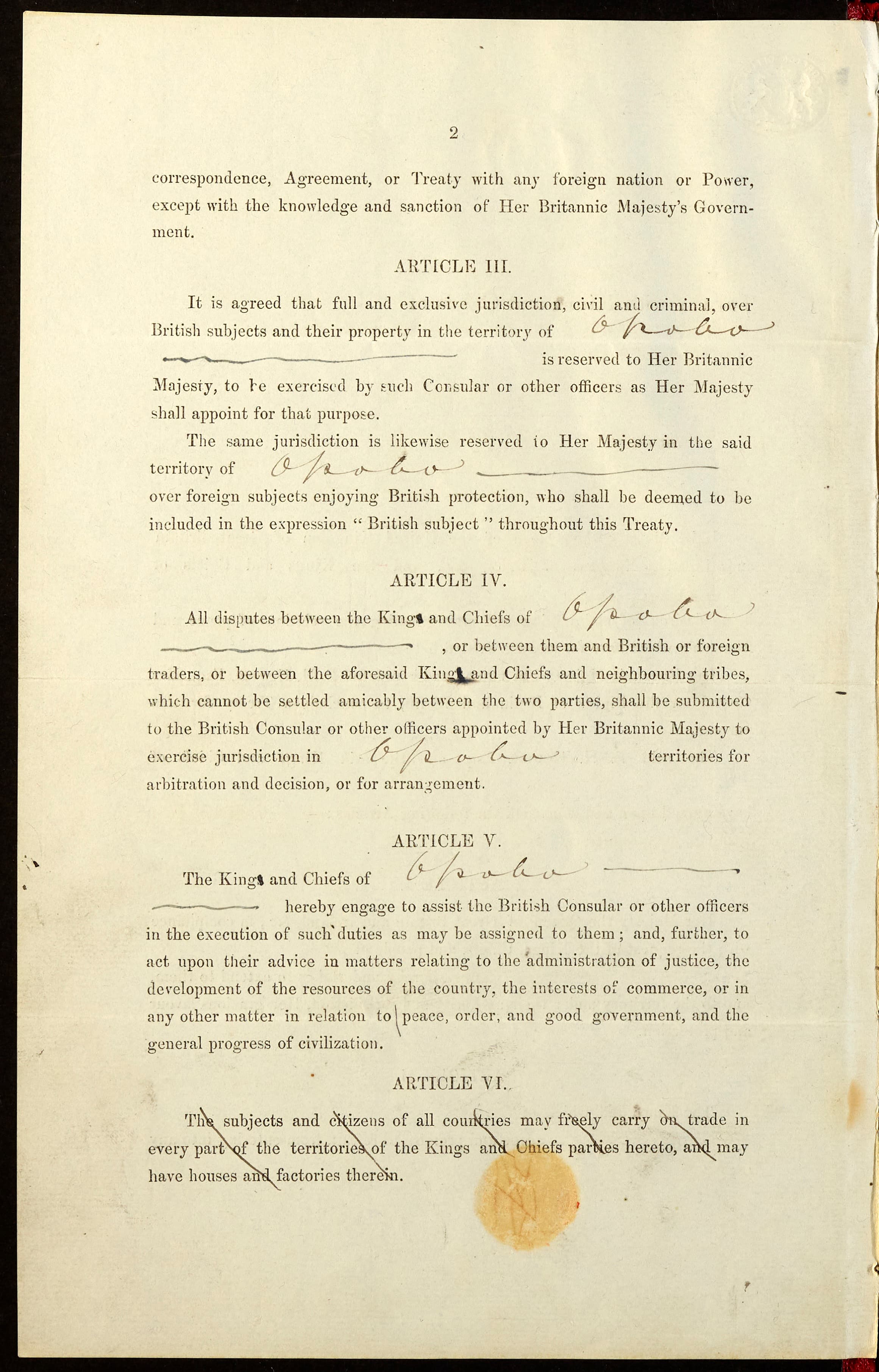 Treaties formed the foundation for governance of the resource extraction economy and echo in disputations against contemporary land use acts (Ebeku 2002). To colonisers treaties and maps were key tools for asserting dominion, legitimizing and enacting dispossession. Article I of the Treaty granted Protection as requested by said nation, king, queen and/or chiefs. Article III and Article IV consolidated Britain’s juridical authority to assign, legislate and adjudicate over territory and commerce. Article V burdened African signatories to assist the colonisers in their every request.